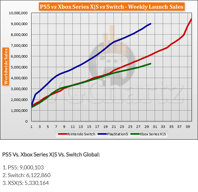 PS5 vs Switch vs XSX/XSS 발매 후 30주간 판매량 비교