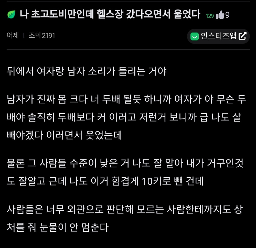 나 초고도비만인데 헬스장 갔다 오면서 울었다...