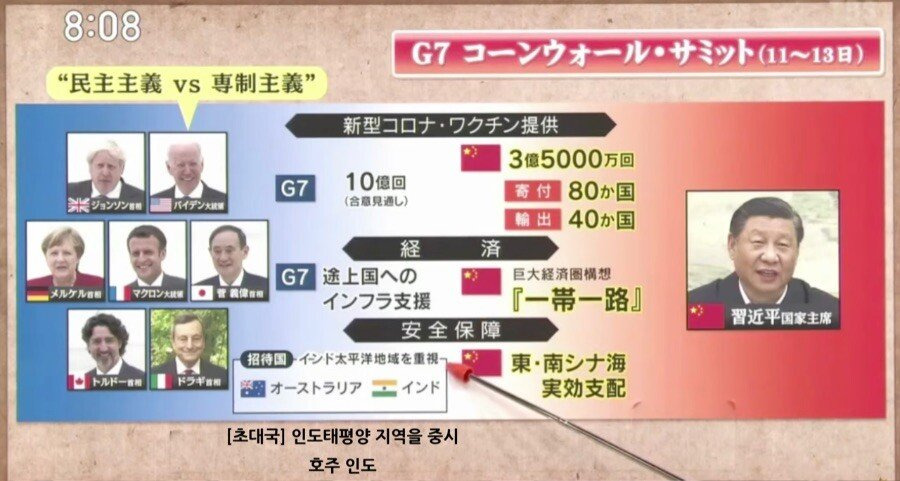 G7 콘월 서밋을 소개하며 초청국 설명하는 부분에 호주와 인도만 들어가 있음.