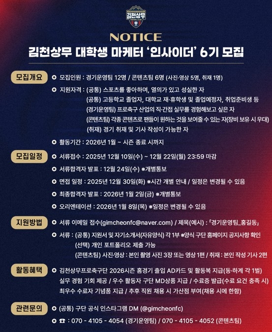 40040 K리그1 김천, 대학생 마케터 인사이더 6기 모집 축구 12:20 1