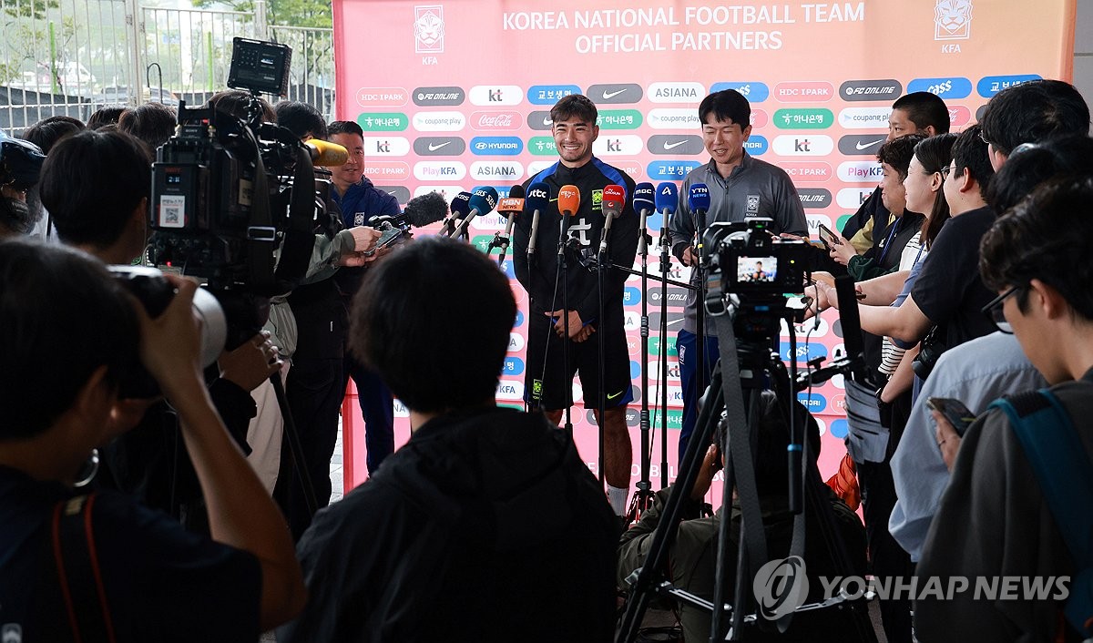 (고양=연합뉴스) 한종찬 기자 = '태극전사' 옌스 카스트로프가 7일 경기 고양시 일산서구 고양종합운동장 보조구장에서 취재진 질문에 답하고 있다. 2025.10.7 [email protected]