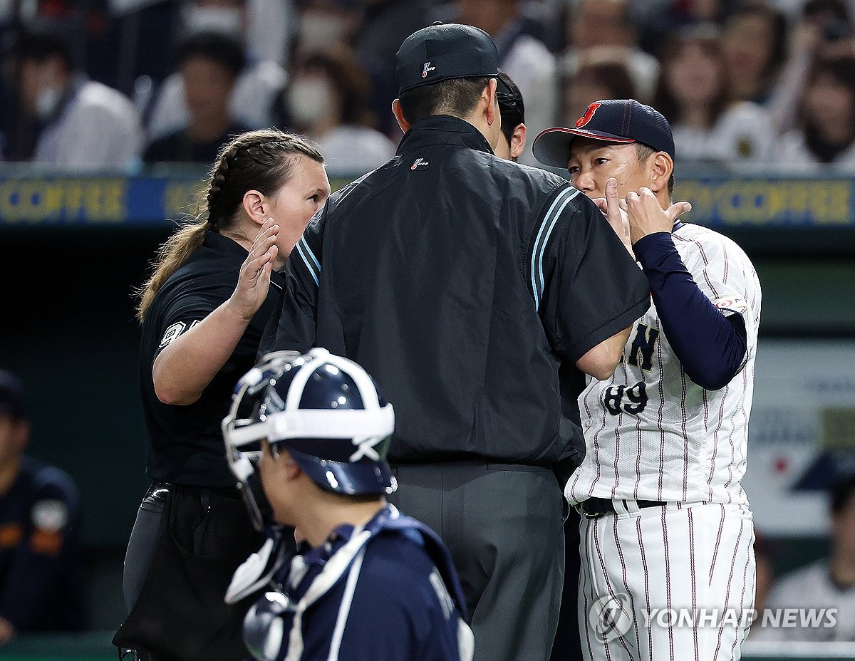 (도쿄=연합뉴스) 이동해 기자 = 15일 일본 도쿄돔에서 열린 2025 K베이스볼 시리즈 대한민국과 일본의 평가전. 일본 야구대표팀 이바타 히로카즈 감독이 그라운드에 나와 심판진에게 어필하고 있다. 2025.11.15 [email protected]