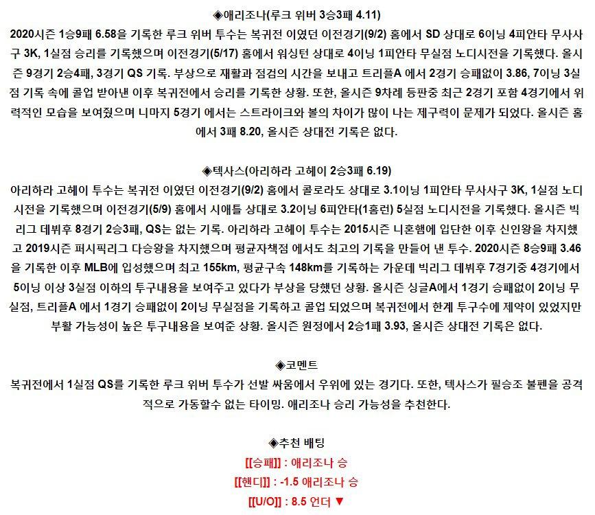 【MLB】 9월9일 애리조나 vs 텍사스 야구분석