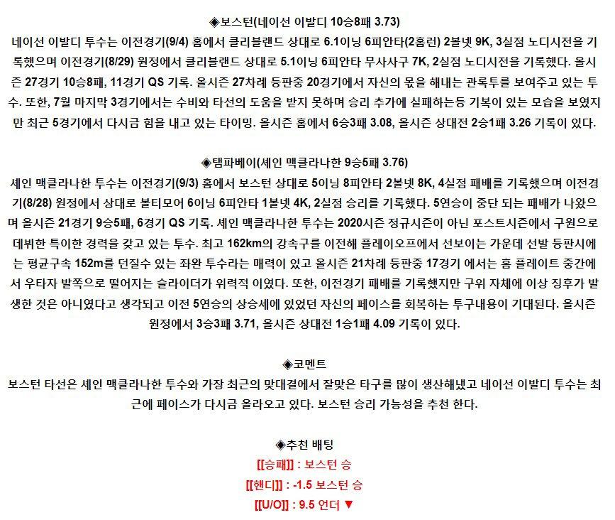 【MLB】 9월9일 보스턴 vs 템파베이 야구분석