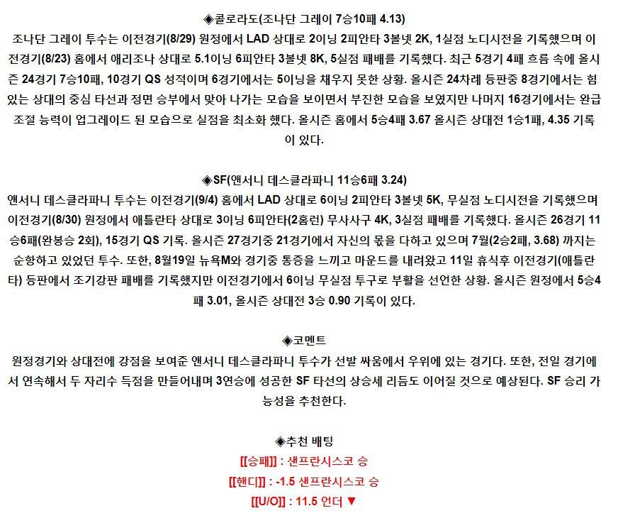【MLB】 9월9일 콜로라도 vs 샌프란시스코 야구분석