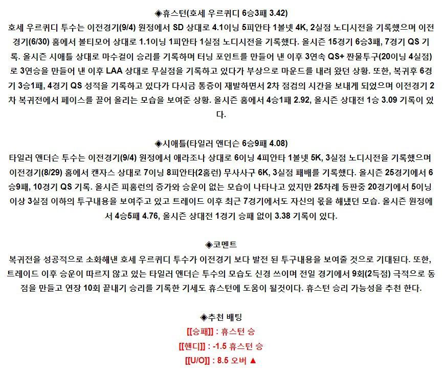 【MLB】 9월9일 휴스턴 vs 시애틀 야구분석