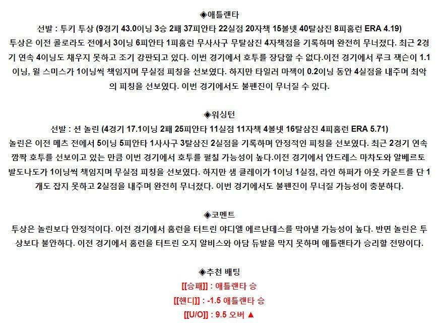 【MLB】 9월9일 애틀랜타 vs 워싱턴 야구분석