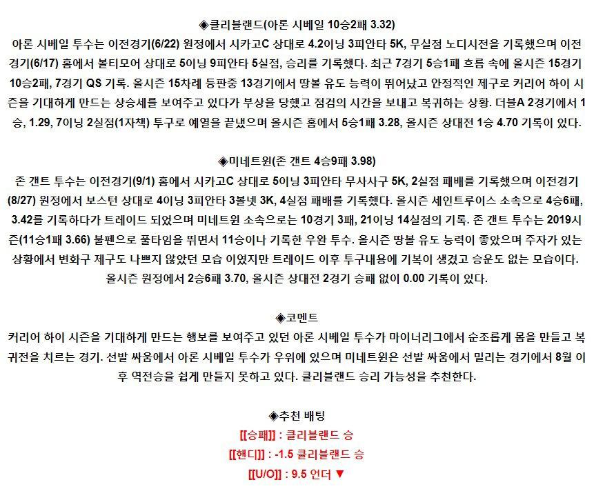 【MLB】 9월8일 클리블랜드 vs 미네소타 야구분석