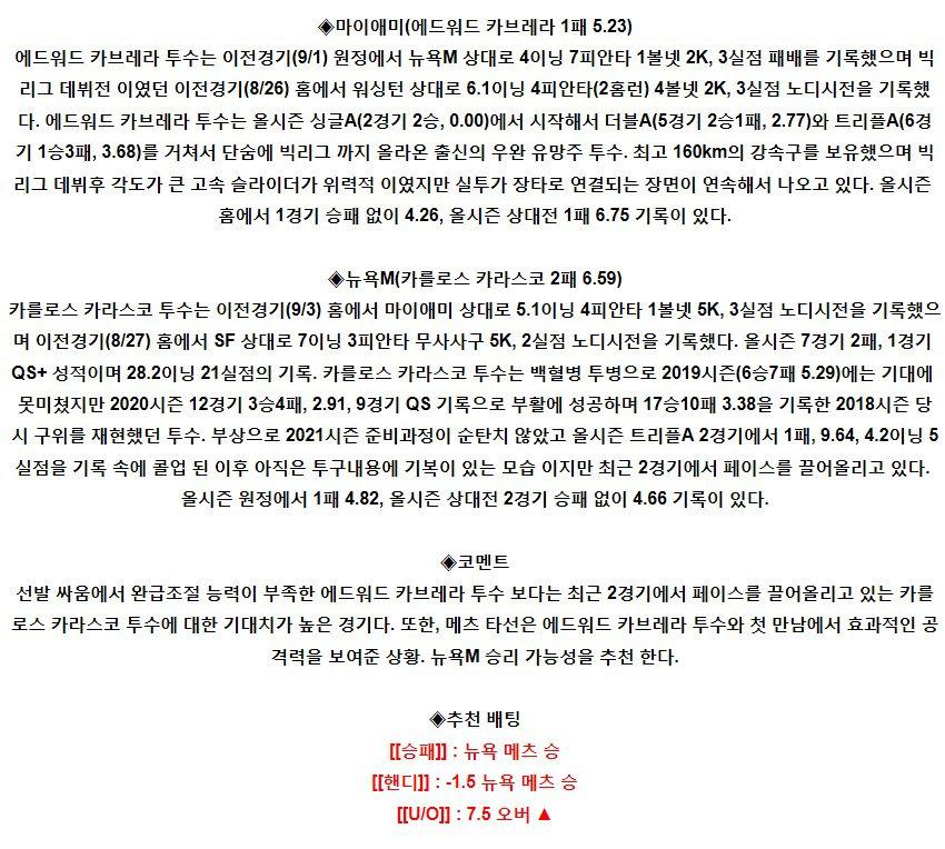 【MLB】 9월8일 마이애미 vs 뉴욕메츠 야구분석