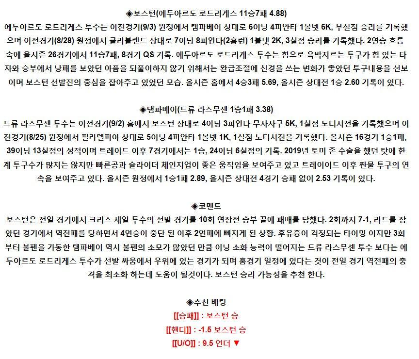 【MLB】 9월8일 보스턴 vs 템파베이 야구분석