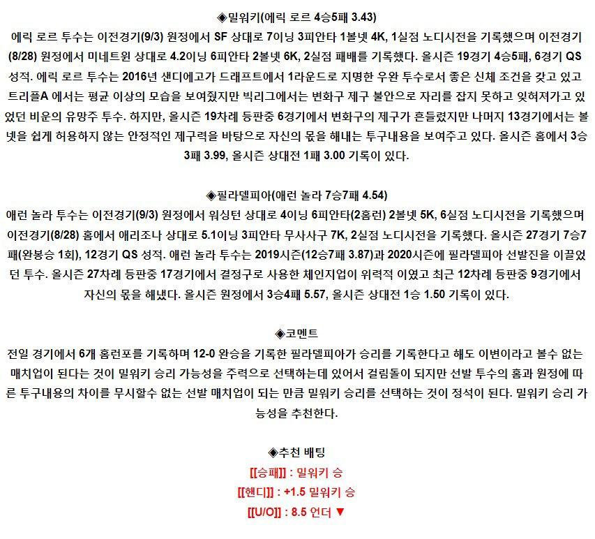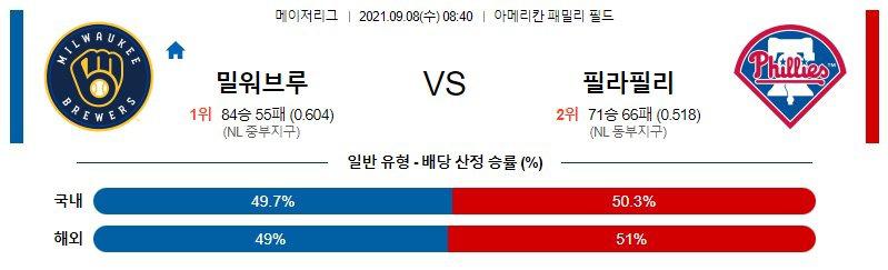 【MLB】 9월8일 밀워키 vs 필라델피아 야구분석