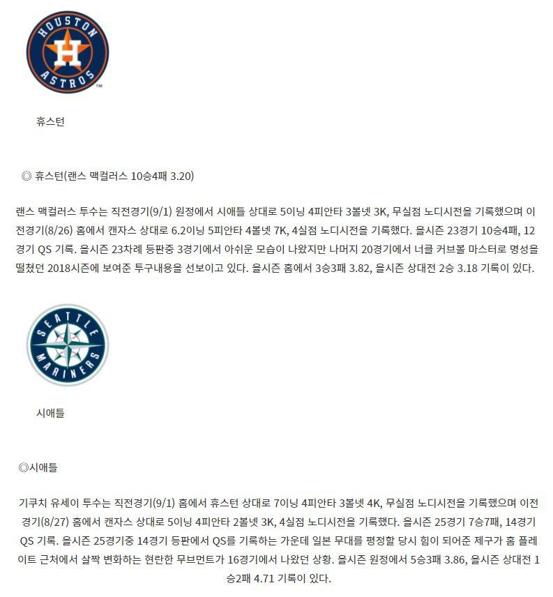 【MLB】 9월7일 휴스턴 vs 시애틀 야구분석