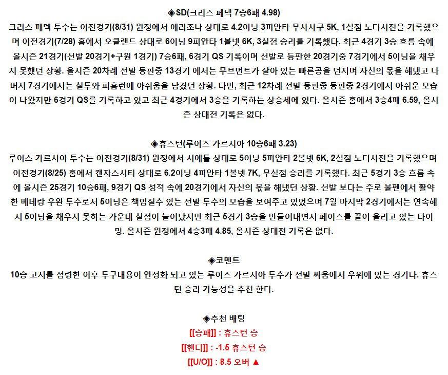 【MLB】 9월6일 샌디에이고 vs 휴스턴 야구분석