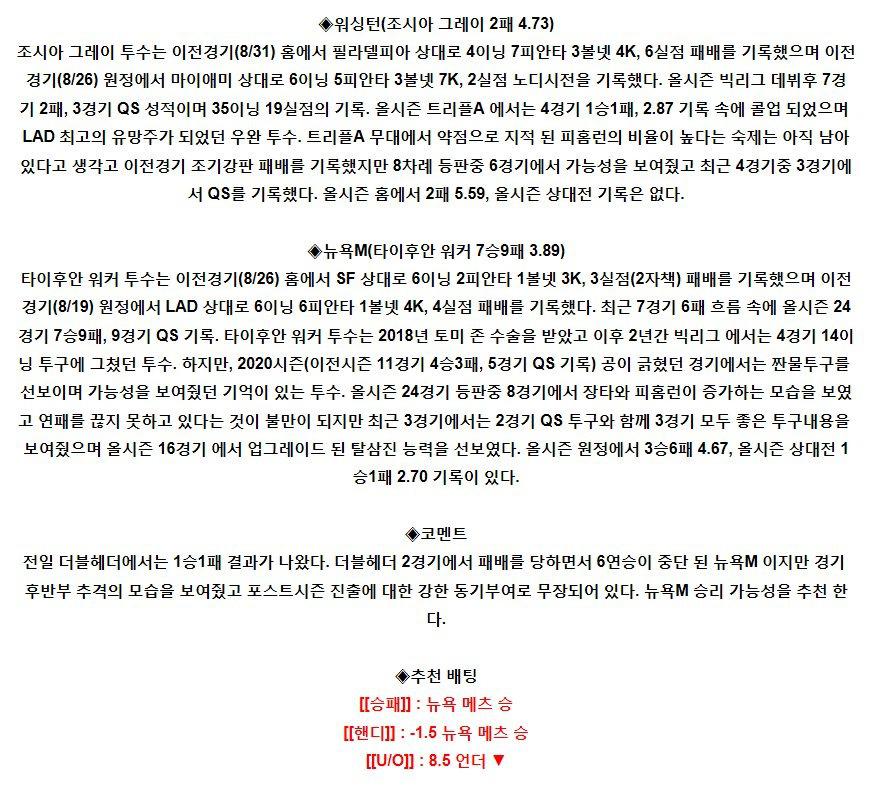 【MLB】 9월6일 워싱턴 vs 뉴욕메츠 야구분석