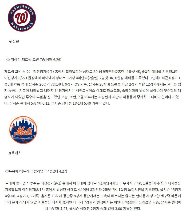【MLB】 9월7일 워싱턴 vs 뉴욕메츠 야구분석