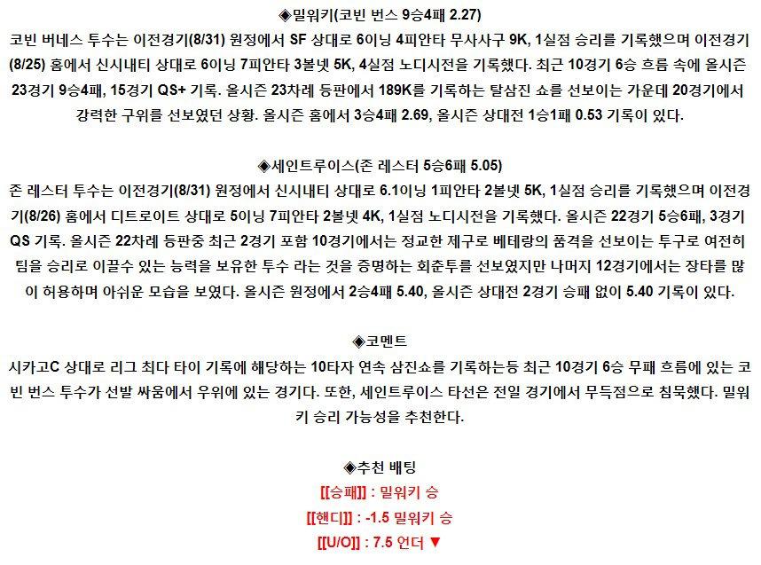 【MLB】 9월6일 밀워키 vs 세인트루이스 야구분석