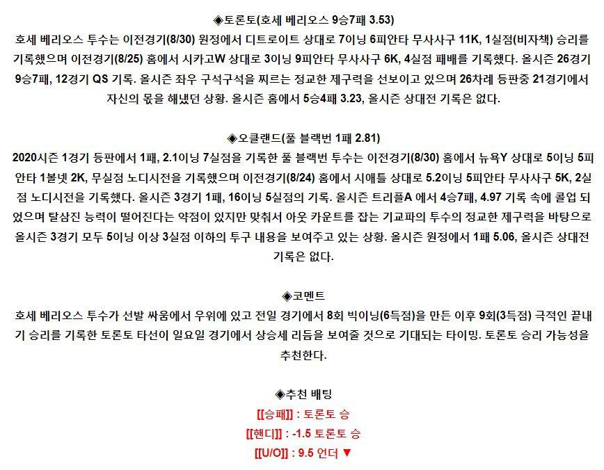 【MLB】 9월6일 토론토 vs 오클랜드 야구분석