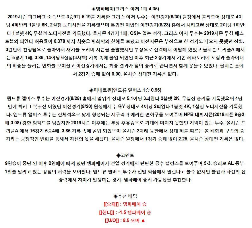 【MLB】 9월6일 템파베이 vs 미네소타 야구분석
