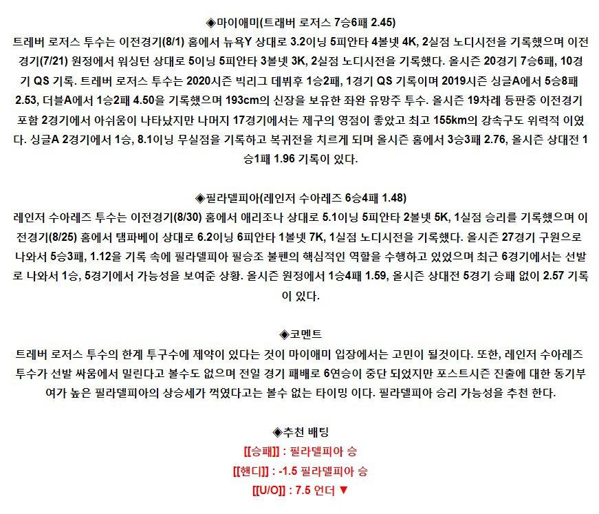 【MLB】 9월5일 마이애미 vs 필라델피아 야구분석 야구중계 해외야구중계 해외야구분석 MLB분석 MLB중계
