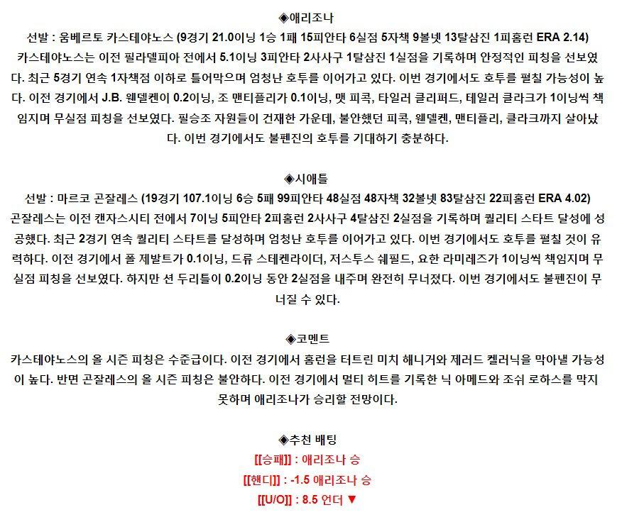 【MLB】 9월5일 애리조나 vs 시애틀 야구분석 야구중계 해외야구중계 해외야구분석 MLB분석 MLB중계