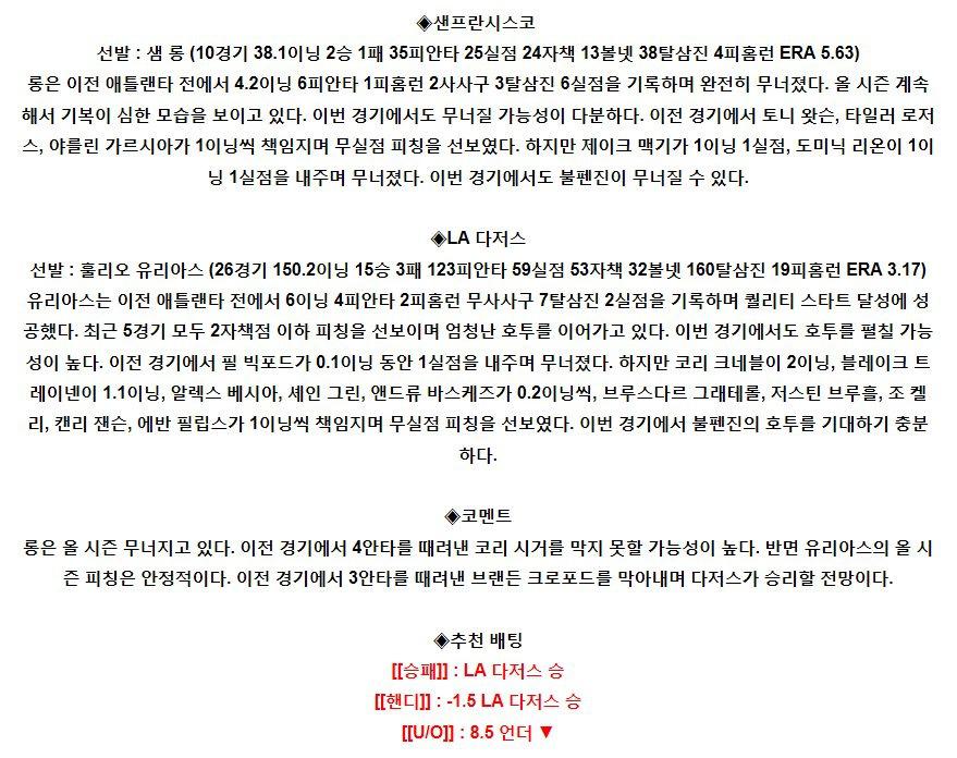 【MLB】 9월5일 샌프란시스코 vs LA다저스 야구분석 야구중계 해외야구중계 해외야구분석 MLB분석 MLB중계