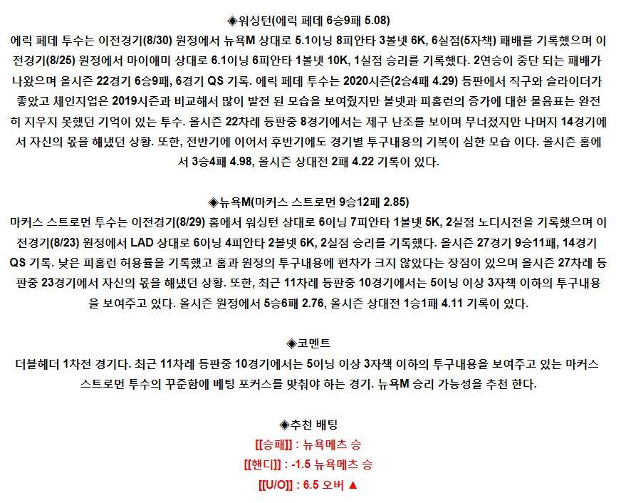 【MLB】 9월5일 워싱턴 vs 뉴욕메츠 야구분석 야구중계 해외야구중계 해외야구분석 MLB분석 MLB중계