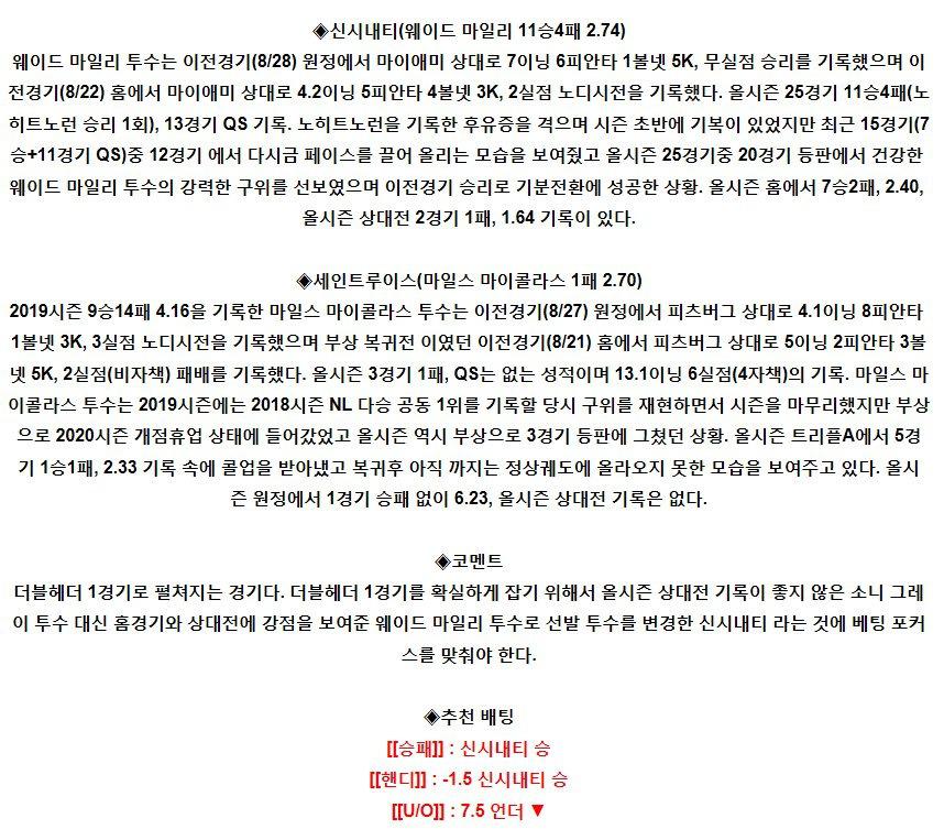 【MLB】 9월2일 신시내티 vs 세인트루이스 야구분석