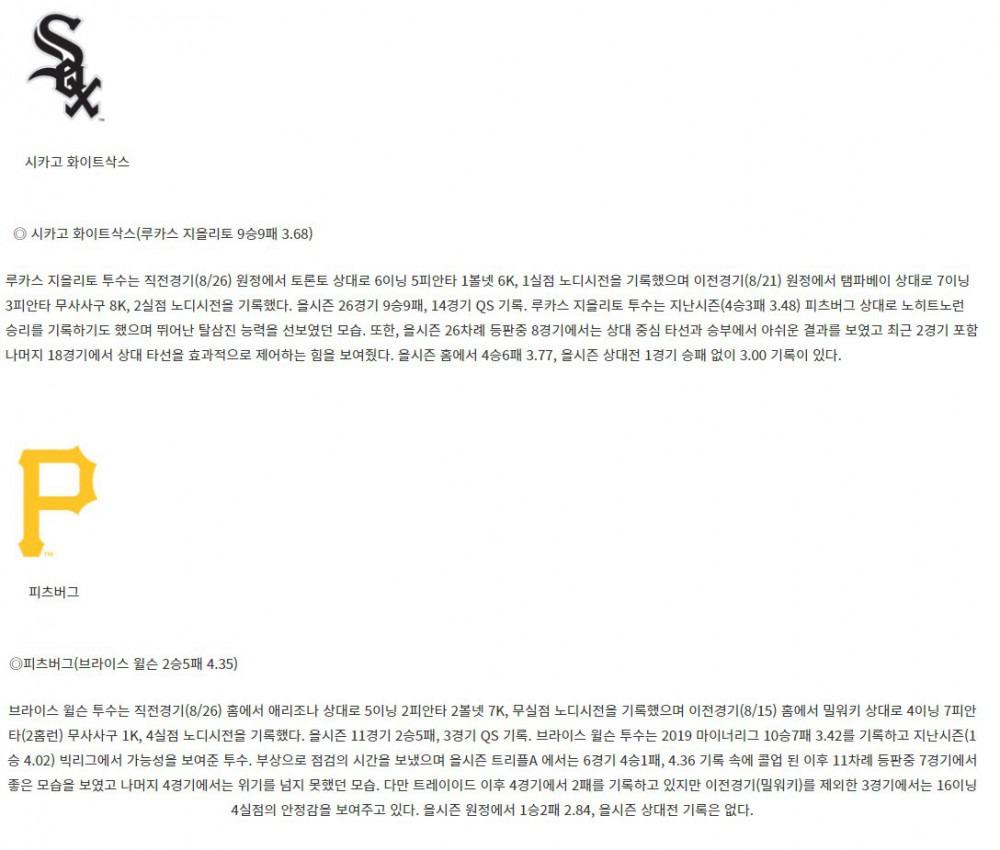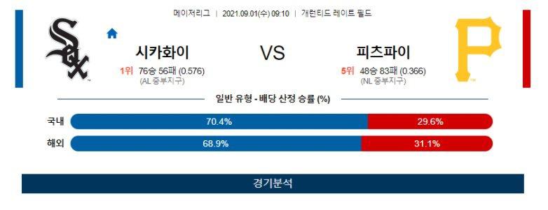 【MLB】 9월1일 시카고화이트삭스 vs 피츠버그 야구분석 야구중계 해외야구중계 해외야구분석 MLB분석 MLB중계