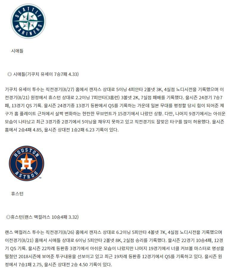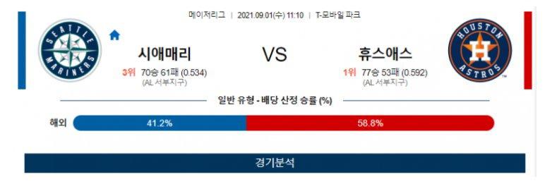 【MLB】 9월1일 시애틀 vs 휴스턴 야구분석 야구중계 해외야구중계 해외야구분석 MLB분석 MLB중계