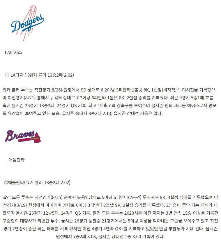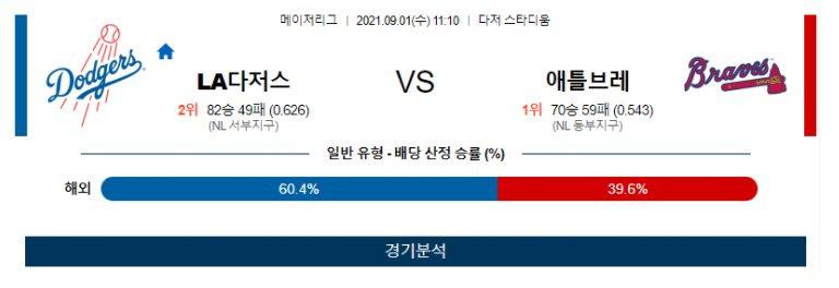 【MLB】 9월1일 LA다저스 vs 애틀랜타 야구분석 야구중계 해외야구중계 해외야구분석 MLB분석 MLB중계