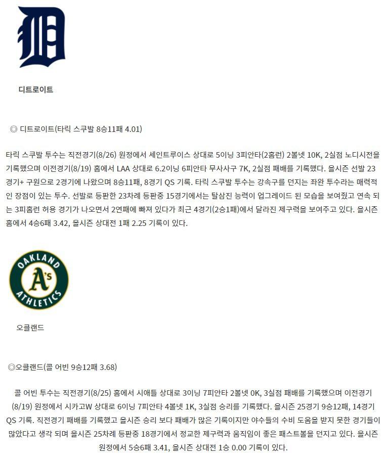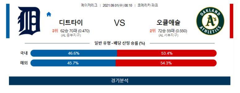 【MLB】 9월1일 디트로이트 vs 오클랜드 야구분석 야구중계 해외야구중계 해외야구분석 MLB분석 MLB중계