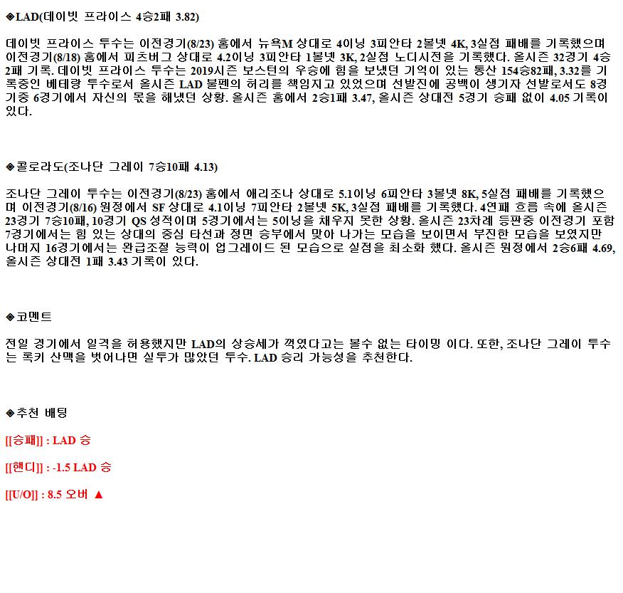 2021년8월29일 LA 다저스 콜로라도 로키스 해외야구중계