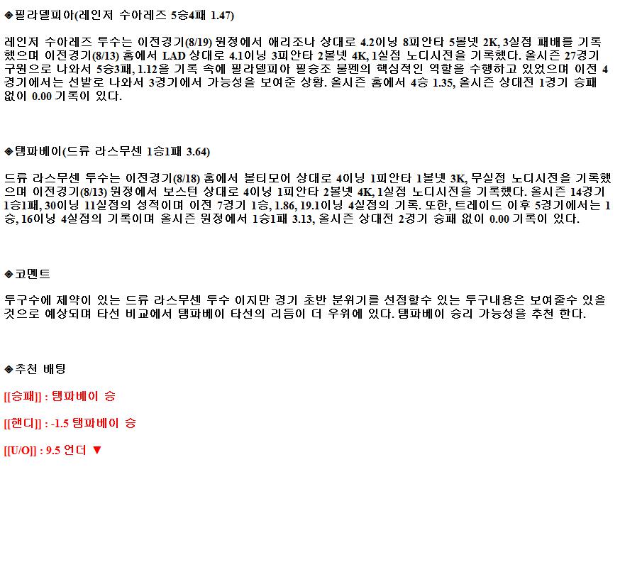 2021년8월25일 필라델피아 필리스아 탬파베이 레이스 해외야구중계