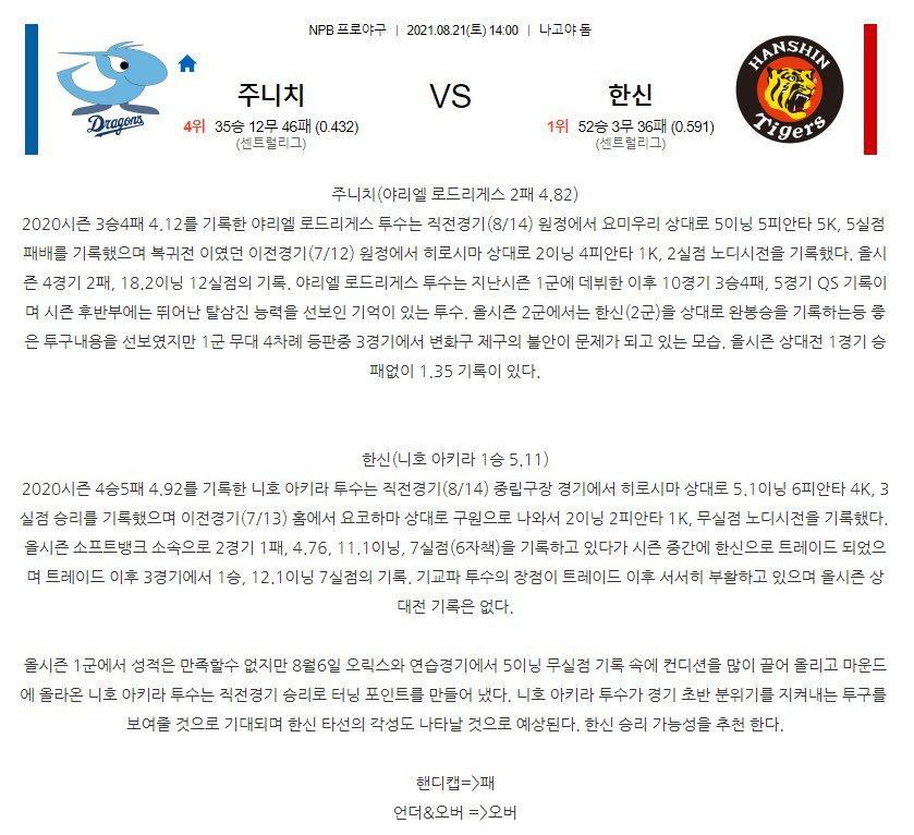 [NPB] 8월21일 주니치 vs 한신 스포츠중계 스포츠분석 야구분석 야구중계 해외야구중계 해외야구분석 NPB분석 NPB중계