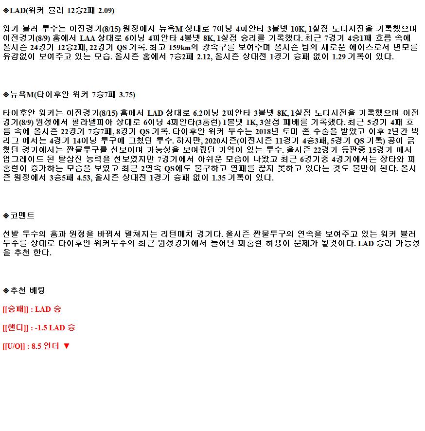 2021년8월20일 LA 다저스 뉴욕 메츠 해외야구중계