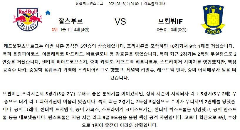 [UEFA챔피언스리그] 8월18일 레드불잘츠부르크 vs 브륀뷔 경기분석