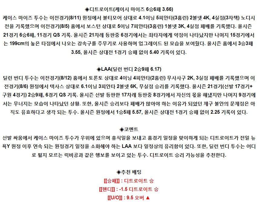 【MLB】 8월18일 디트로이트 vs LA에인절스 야구분석