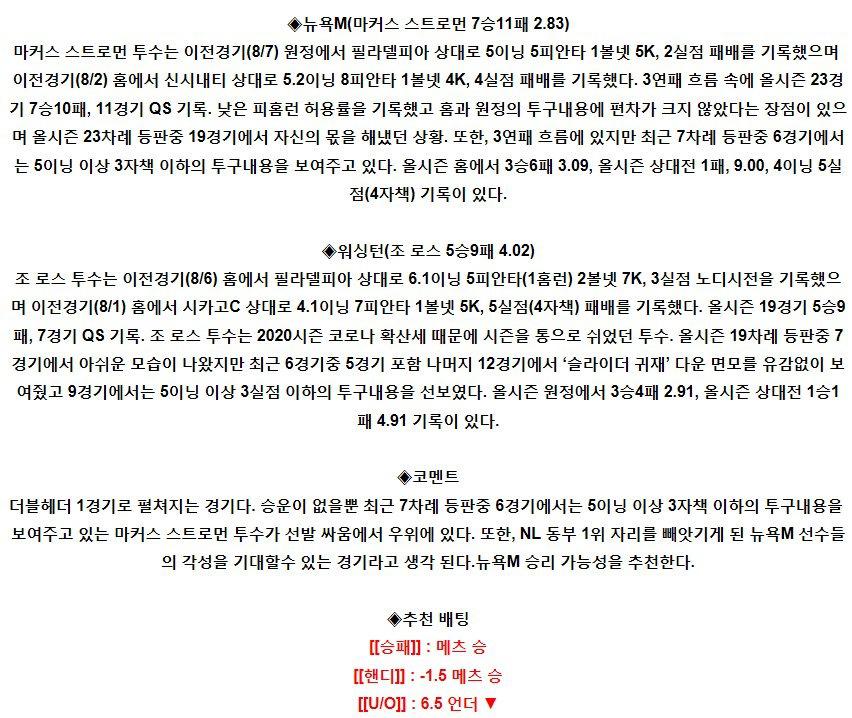 【MLB】 8월13일 뉴욕메츠 vs 워싱턴 야구분석