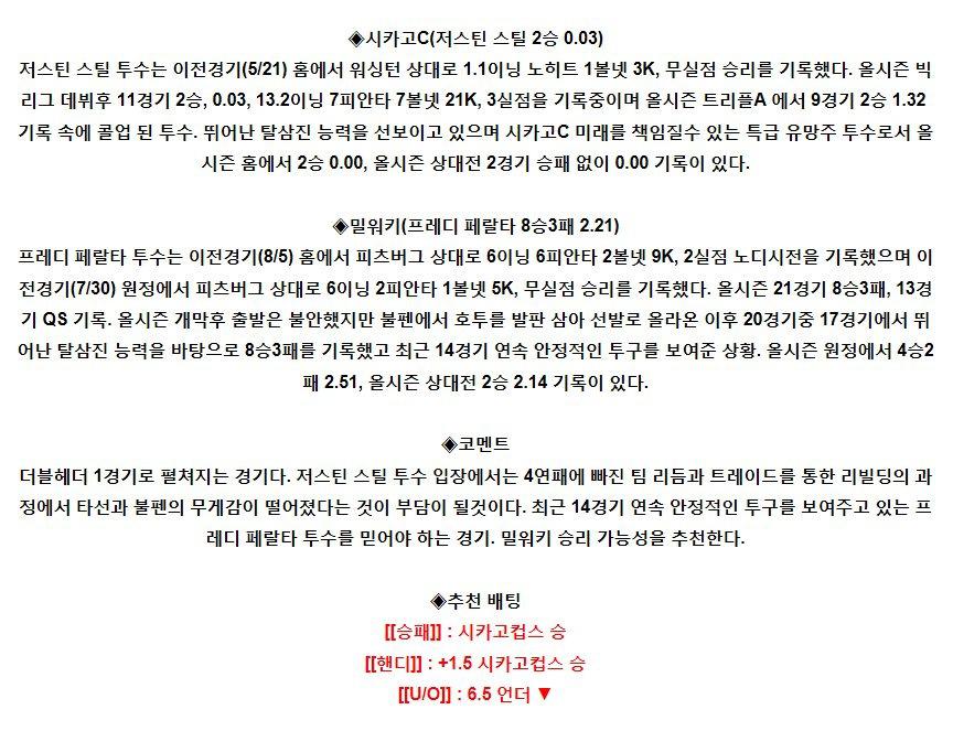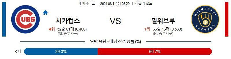 【MLB】 2021년 8월11일 시카고컵스 vs 밀워키 해외야구분석