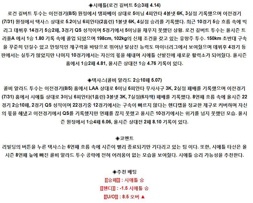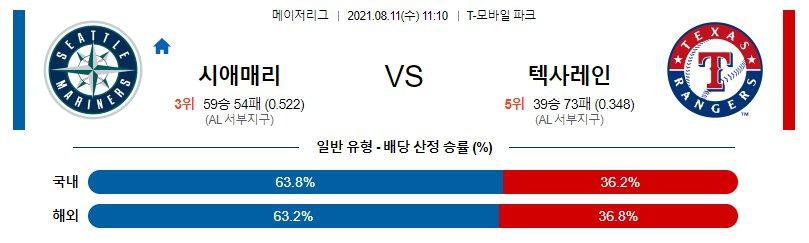 【MLB】 2021년 8월11일 시애틀 vs 텍사스 해외야구분석