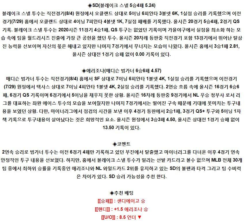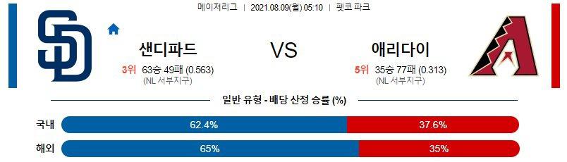 【MLB】 8월9일 샌디에고 vs 애리조나 해외야구분석