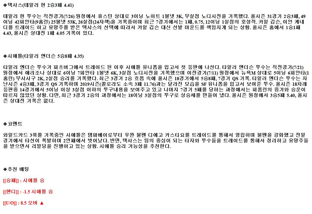 2021년8월1일 MLB 텍사스 시애틀 해외야구중계