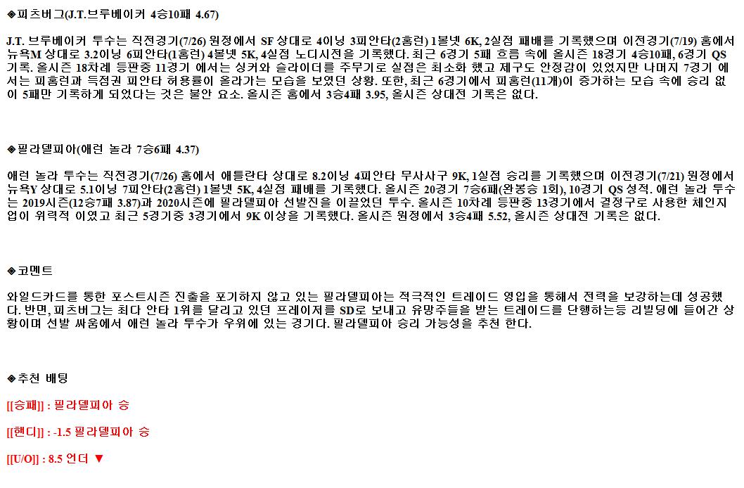 2021년8월1일 MLB 피츠버그 필라델피아 해외야구중계