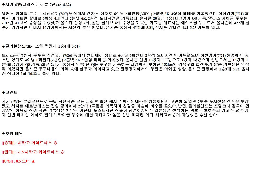 2021년8월1일 MLB 화이트삭스 클리블랜드 해외야구중계