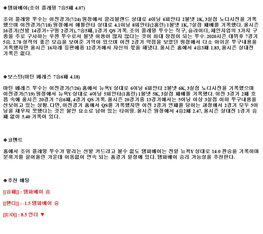7월31일 MLB 탬파베이 보스턴 해외야구중계