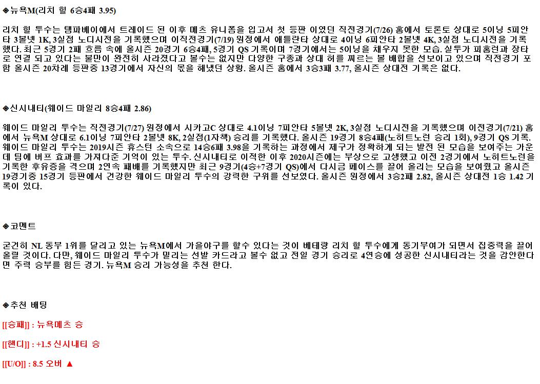 2021년8월1일 MLB 뉴욕메츠 신시내티 해외야구중계