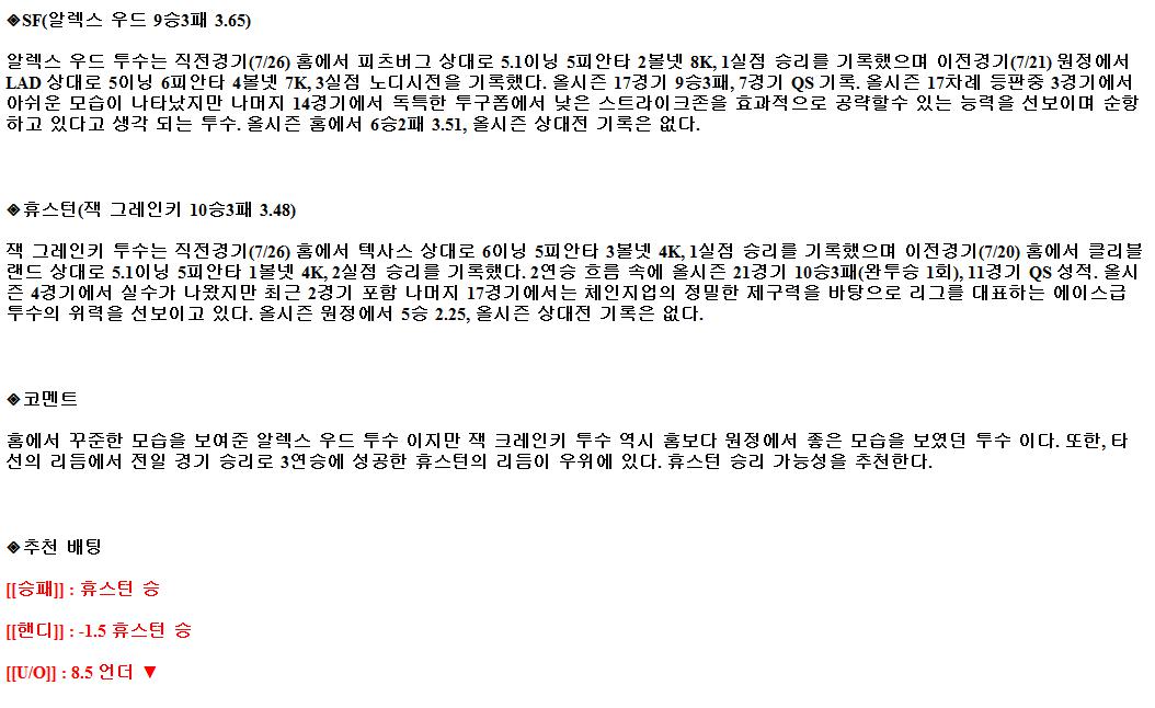 2021년8월1일 MLB 샌프란시스코 휴스턴 해외야구중계
