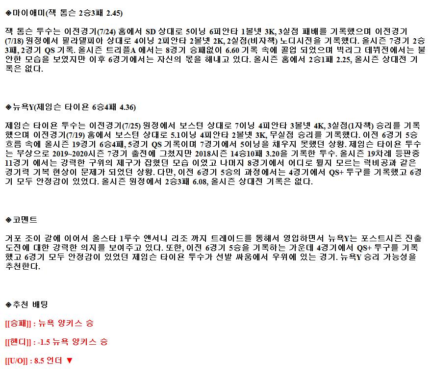 7월30일 MLB 탬파베이 뉴욕양키스 해외야구중계