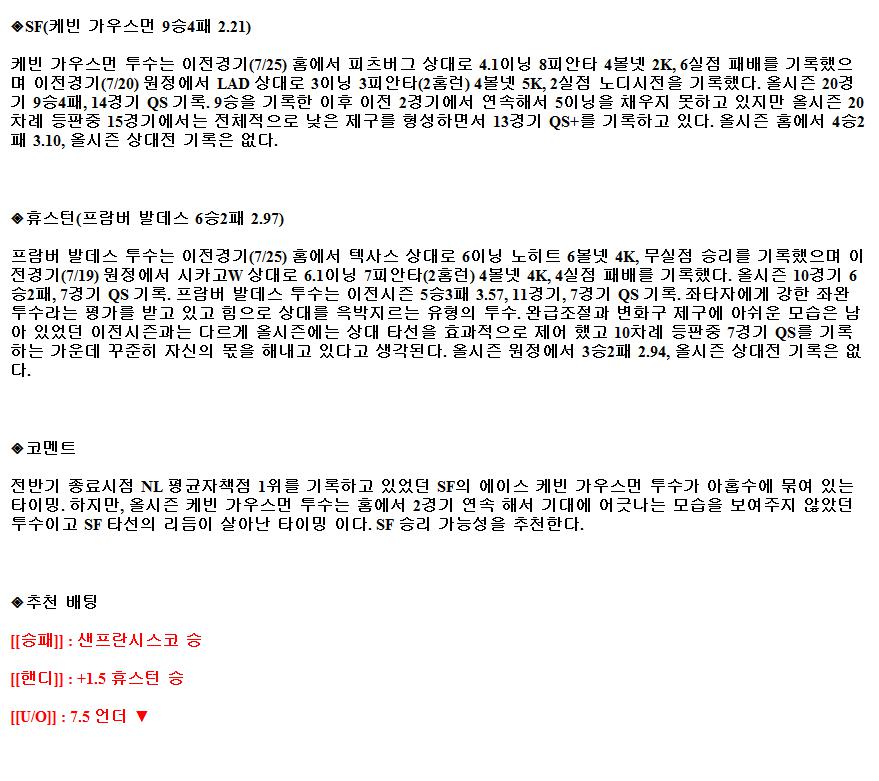 7월31일 MLB 샌프란시스코 휴스턴 해외야구중계
