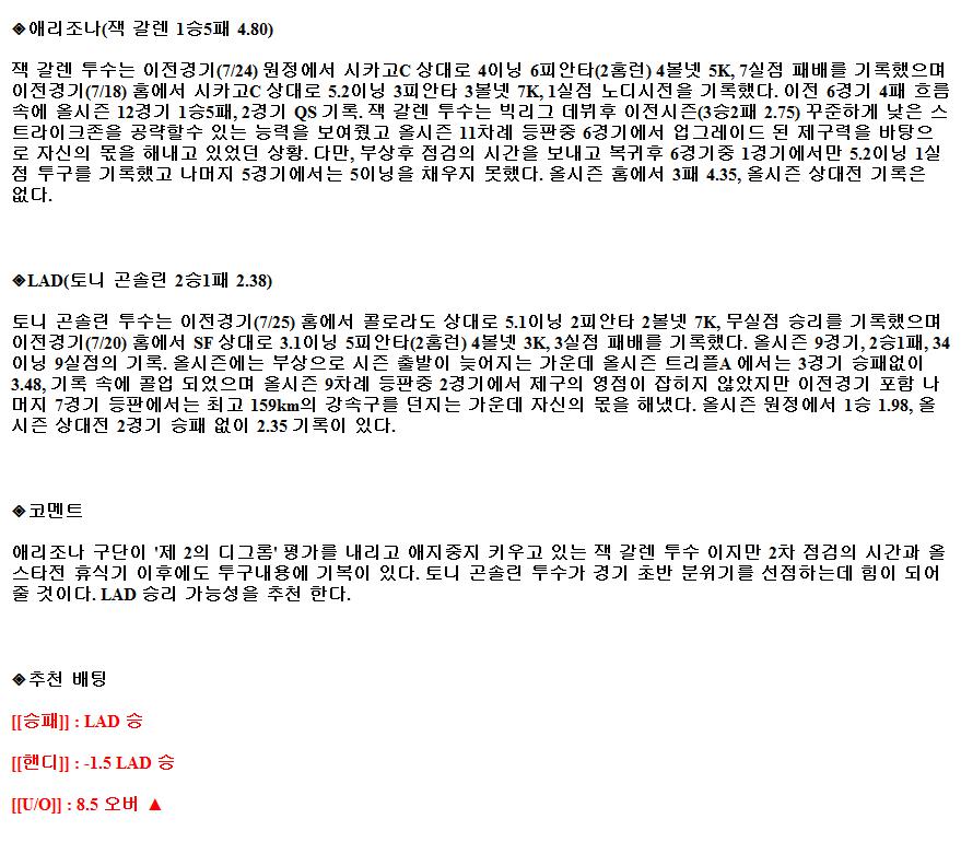 7월31일 MLB 애리조나 LA다저스 해외야구중계